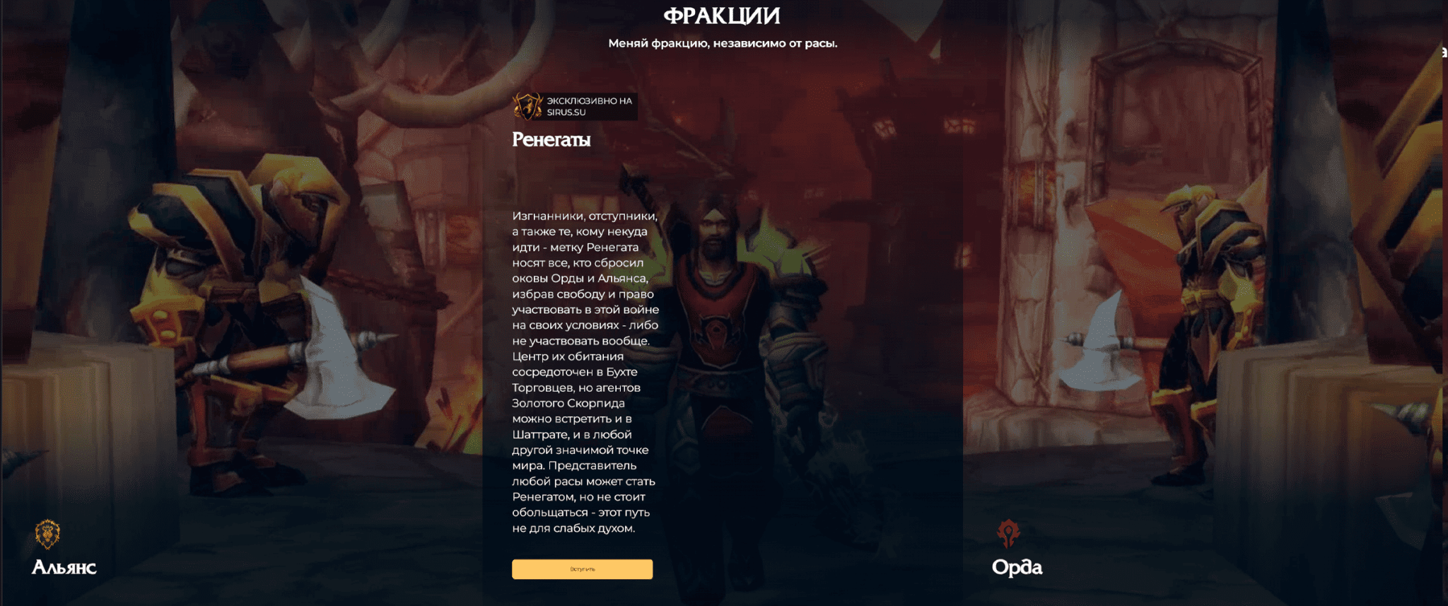 Для тех, кому тесно в рамках противостояния Орды и Альянса, Сирус предлагает стать Ренегатом. Это третья полноценная фракция изгоев, которая обладает собственной столицей и уникальной квестовой цепочкой. Ренегаты враждебны всем, что превращает их игру в постоянное выживание в открытом мире. Механика Охота за головами позволяет игрокам назначать награду за убийство конкретных персонажей, добавляя в игровой процесс элементы настоящего азарта и социального взаимодействия.