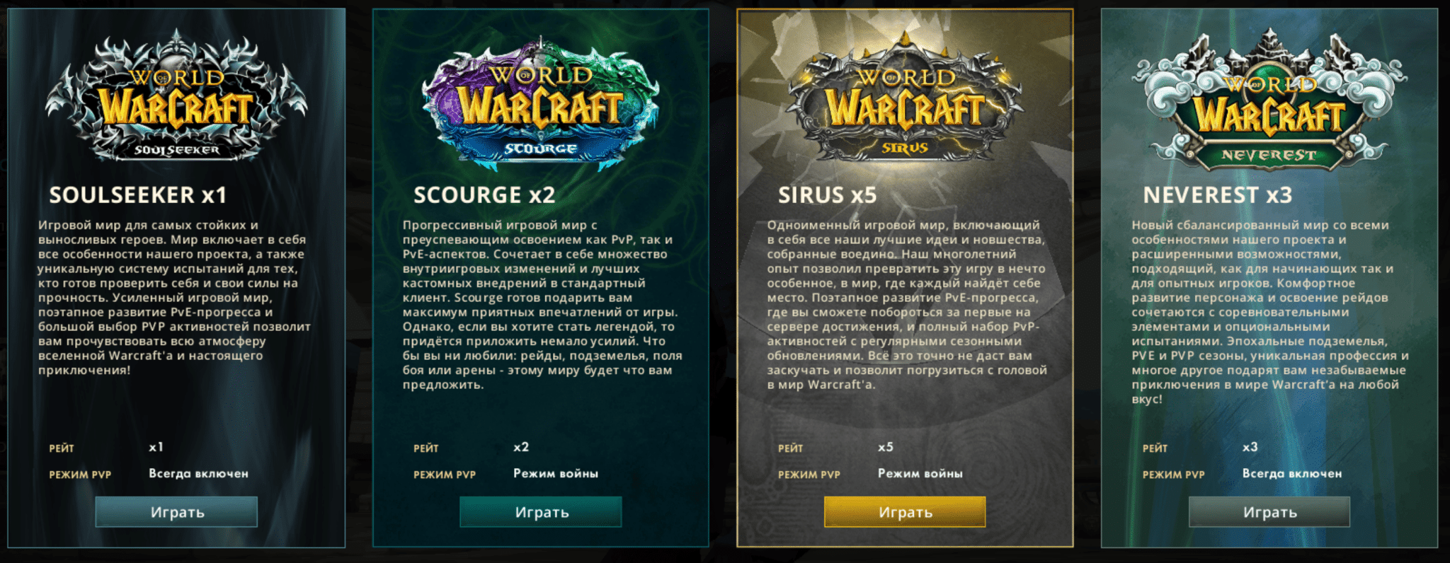 Сервер предлагает четыре уникальных реалма, каждый из которых ориентирован на своего игрока: