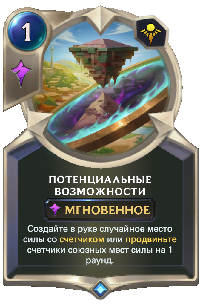 Теперь про заклинания, их, кстати, всего два. Первое оказалось весьма разочаровывающим – Потенциальные возможности. Эффект таков: создайте в руке случайное место силы со счётчиком, или продвиньте союзное место силы на 1 раунд. Хоть оно и дешёвое, всего 1 мана в стоимости, но эффект ну очень слаб. Ведь какое-либо другое место силы вам не нужно будет, если вы уже в колоде имеете своё место силы. А продвинуть союзное место силы можно и картами, что попросту имеют больший потенциал. Как, например, следующая карта.
