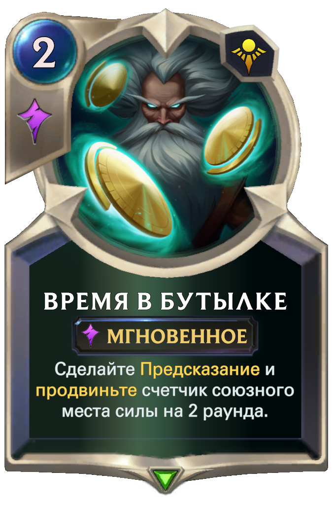 Время в бутылке. Заклинание, что уже дороже предыдущего, но намного лучше в плане своего потенциала. Ведь не только продвигает на 2 раунда вперёд вместо одного, но ещё и позволяет сделать предсказание, то есть, по сути, смоделировать свою будущую игру заранее. Выбрать лучший вариант для “топ дека”, а не ждать и надеяться на всемогущий рандом. А разница по мане для заклинания в Рунтерре не так и существенна.
