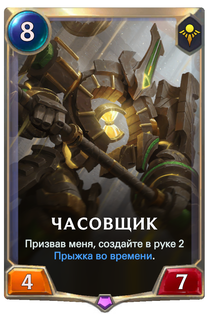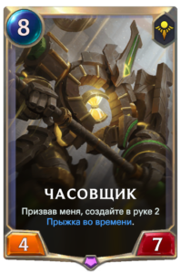 Следующим существом на разборе выступит Часовщик. Он так же, как и Реставратор имеет слабые характеристики за свою мана стоимость. И довольно спорный эффект, если говорить откровенно. Ведь суть всех ускорений во времени заключается в ускоренном приближении какого-либо момента. Как пример, быстрое появление на столе Рабов морозной стражи. Их основной момент игры, когда они имеют наибольшее влияние на стол и всю партию — это средняя стадия игры. Так как в конце партии уже доступны многим регионам сильные зачистки стола, или же существа, что намного сильнее наших Рабов морозной стражи. А в начале партии их попросту не выпустить. Поэтому, они сильнее всего в середине.