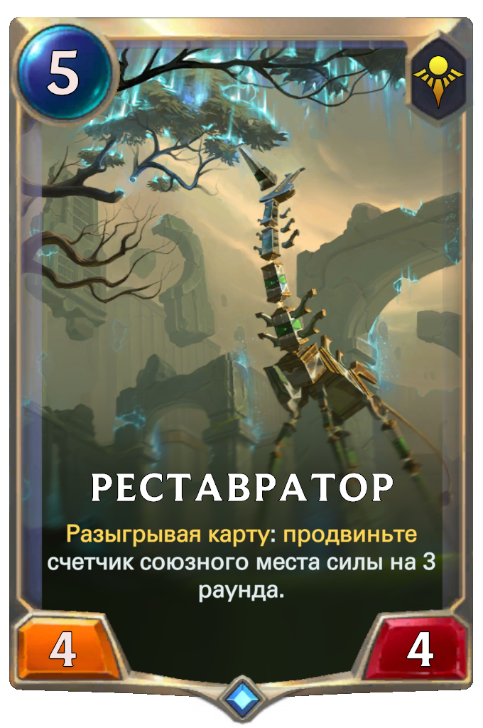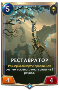 Пожалуй, разбор новых карты начнём с существ. Реставратор — это новое существо региона Шурима, что за свою мана стоимость в 5 единиц имеет откровенно неважнецкие характеристики, но зато обладает отличным эффектом. Отдаленно напоминает другую карту — Дарклорна-инквизитора. И даже по мане и характеристикам они одинаковы. Но в отличии от Дарклорна, Реставратору не нужно ждать, чтобы ваши Места силы дошли до определенного счётчика, ведь он сам продвигает этот счётчик на 3 вперёд. Кстати, эти ребята могут неплохо смотреться вместе — моментально ускоряя пробуждение Ледяных рабов.