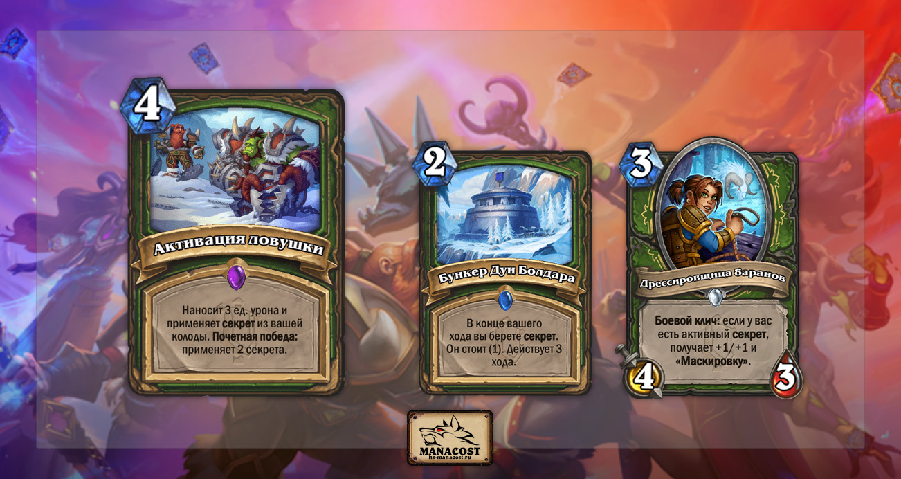 Новое дополнение резко предложило классу сразу 3 карты, построенные вокруг секретов, но пока что работают друг с другом они неважно. Бункер Дун Болдара достанет для вас секреты, но на них придется потратить еще по 1 мане, что позволит выложить 3 секрета за 5 маны в сумме. Не очень заманчивое предложение, особенно с учетом того, что сразу сделать этого не получится. Дрессировщица баранов вписывается в кривую маны с Бункером Дун Болдара только с Монеткой — в другой половине партий Охотнику нужен иной план на игру.