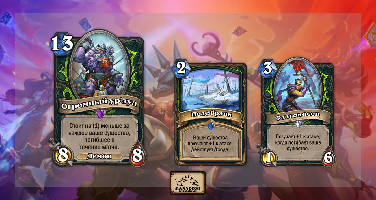 Разработчики явно хотят увести Охотника на демонов от комбо колод. Кроме Биг ДХ на это намекает все больше карт для Токен Охотника на демонов. У Токен ДХ уже было достаточно много поддержки за последние 2 года, но пока что архетип не находит себя. И если Поле брани с Флагоносцем не производят внушительного впечатления, Огромный ур’зул им сильно помогает.