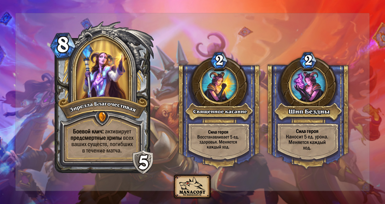 Зирелла Благочестивая явно предназначена для подобных колод. Забавно, что другая новая карта, Неупокоенная послушница, ничего не дает самой Зирелле, поскольку у нее нет атаки, которая требуется для урона. Хотя в архетип она все равно напрашивается.