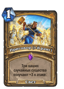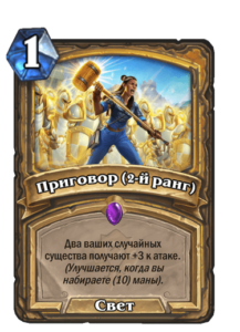 Приговор хорош в мид и лейтгейме из-за второго и третьего рангов заклинания. В лейтгейме Приговор можно сравнить с Диким ревом Друида. Может быть, Паладин будет чаще играть от заспама стола мелкими угрозами и силой героя. По крайней мере Приговор поощряет такой стиль игры, а массовые баффы характеристик — редкая и ценная способность Паладина. Тем более бафф работает на любые угрозы, а не только на Паладинов-рекрутов.