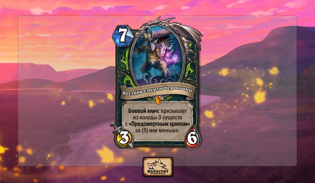 Некоторые игроки называют Вестника смерти Черношипа одной из самых сильных карт Закаленных Степями. Сравните легендарку со Зверями-защитниками. Да, она не дает угрозам натиск, да и в колоду можно взять только одну копию. Зато сам по себе Вестник смерти Черношип обладает характеристиками, да и призывает трех существ из колоды, а не двух.