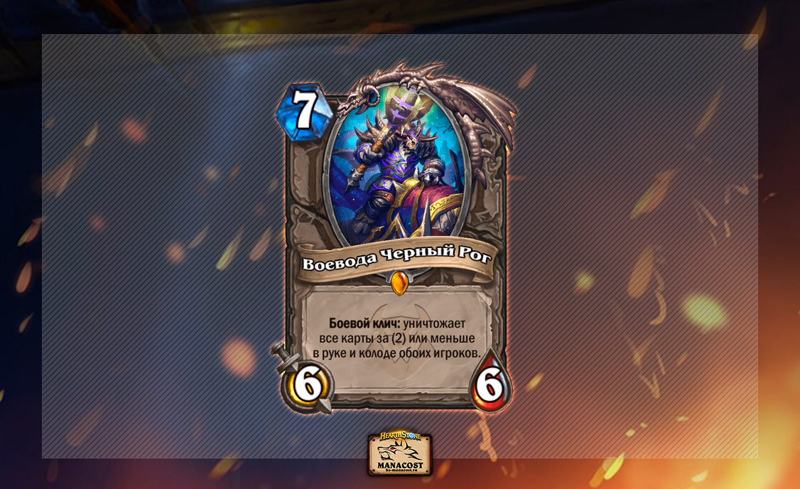 Сильные разрушительные эффекты часто встречались в Hearthstone — Бум-босс То’грун, Безумный герцог Теотар, Грязная крыса, Билетикус — продолжать можно долго. Но они почти всегда имели один из недостатков: либо рандомность, либо сложность в реализации. Единственный минус Черного Рога — это проседание по темпу, но это ничто для колод, которые не стараются играть или могут не играть в темп.