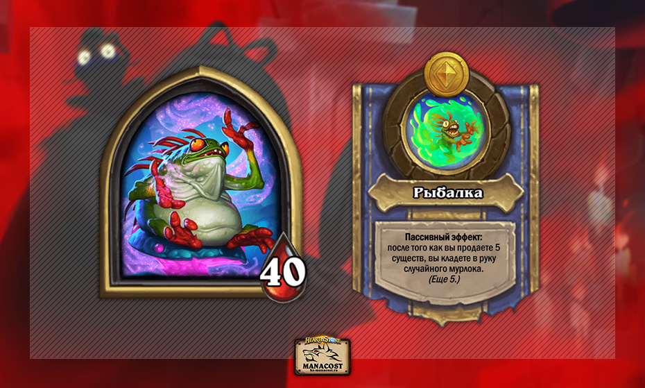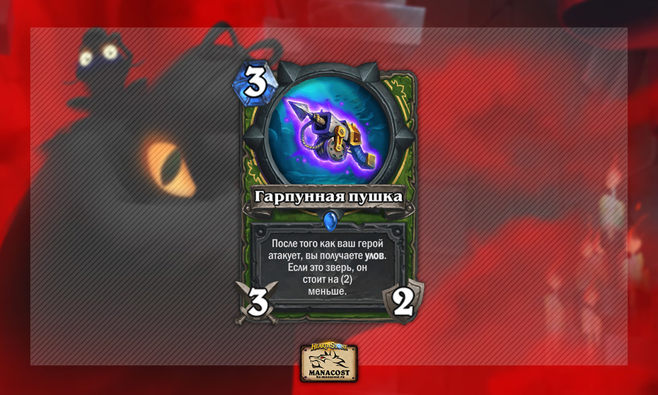Пострадала и Гарпунная пушка. Опять же, нерф достаточно скромный: стоимость оружия всё та же, урон и прочность тоже. Удешевление с 3 до 2 маны, конечно, важно, но Гарпунная пушка все еще выглядит неплохо. К тому же еще до нерфов шла речь о том, что архетип не держится только на этом оружии. Найти зверей с улова с Гарпунной пушки получалось далеко не всегда, и это не какая-то ключевая комбинация для Биг Бист Охотника.