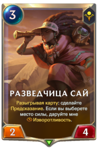 Разведчица сай же, является очень приятной по характеристикам за такую стоимость и с довольно хорошим эффектом. Ведь колоды на механике изворотливость будут всегда, а это и предсказание вашего места силы, так еще и оборона против существ с ключевым словом изворотливость. Карта также вероятно будет играть в колодах Шуримы с местами силы.