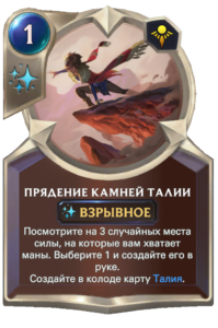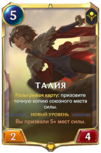 Карта похожа на предыдущую, но с более сильным и быстрым эффектом. Да, стоимость больше, но за нее вы получаете того же самого камненосца, так еще и сверху бафф на вашего сильнейшего союзника и все это, при идеальном темпе, выйдет на 6 ход. Однако, данный бафф имеет условие в призывании мест силы. Не думаю, что 4+ мест сил станет проблемой, ведь если мы должны призвать, а не разыграть, то это значит, что копия, призываемая Талией, будет считаться. Хочется упомянуть ранее показанную карту, Большое будущее, которая удваивает эффект отсчета, данное заклинание даст нам просто невообразимое количество характеристик, а если такое место силы скопировать Талией, противника почти ничего не сможет спасти. Все это звучит привлекательно, много характеристик, копирование, но все это перекрывает лишь одно и это агрессия, она не даст вам разыграть столько карт, также уничтожение мест сил никто не отменял, так что силу данной карты, как и Спящего Камненосца, мы увидим лишь на практике, а пока лишь догадки и теории.
