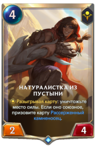 А вот и сторонники, синергирующие с местами силы. Натуралистка из пустыни очень универсальная, она может как уничтожить вражеское место силы, так и бесполезное союзное, но за союзное призовется Рассерженный камненосец. Сами характеристики существа средние, схожи с характеристиками Виктора. Карта станет прекрасным дополнением к колоде, основанной на местах силы.