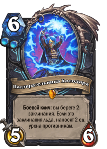 Второй, как вы догадались, это поднять стоимость заклинания до 8. Такой вариант, скорее всего, неприятно ударит по кривой Фрост ДК, у которого нет тяжелых дропов. Очень часто старые берн сборки сидели без дела ровно до того момента, пока не начинали перехватывать инициативу Яростью ледяного змея и после закидывать оппонента взрывным уроном. Если выход карты отложится на целый ход, этот план на игру придется основательно переосмыслить. Кроме того, с полупустой рукой Ярость ледяного змея отлично ложилась в кривую маны с Надзирательницей Холодарой. Изменение стоимости ударит и по этой комбинации.