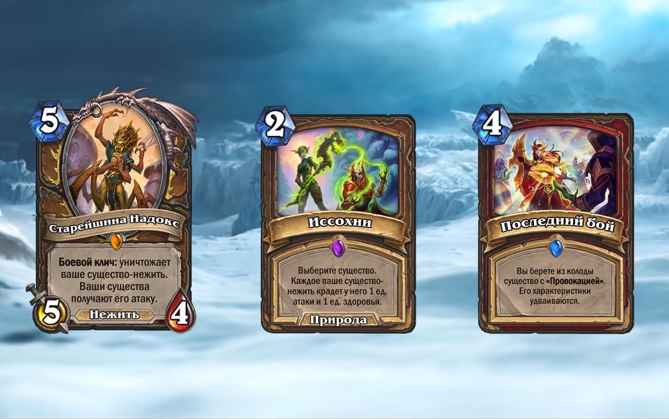 Еще три карты, которые хотелось бы увидеть в мете. У Друида в Марше Короля-лича было много синергий мелких существ и нежити. Но к сожалению, он совсем их не использует. Если Агро Друидом и играют, то новых карт в деку не берут. Чтобы как-то стимулировать игроков, можно баффнуть Старейшину Надокса и Иссохни — способы массовых баффов. Обе карты можно сделать дешевле на 1 ману.