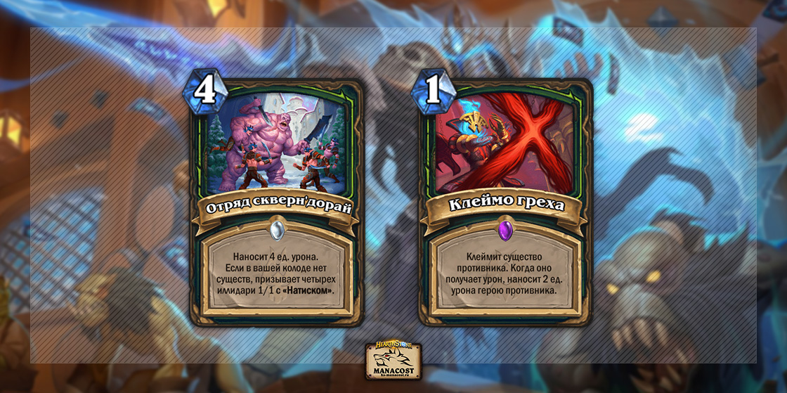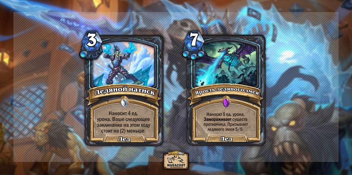 В первую очередь речь идет, конечно же, о Ледяном натиске. Карту очень легко уместить в любой ключевой ход, она дает слишком много выгоды при копировании Леди Смертный Шепот и ее легко скомбинировать с уроном от заклинаний или Морозной смертью. Чтобы ее стало сложнее использовать, ей можно поднять стоимость до 4 маны или убрать 1 ед. удешевления. Как вариант, заклинанию можно снизить урон.