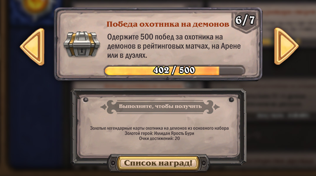 - Золотые версии карт Основного набора могут быть разблокированы путем выполнения специальных достижений. Для получения всех золотых версий карт отдельного класса обычной/редкой/эпической/легендарной редкости нужно достичь соответственно 50/100/250/500 побед за этот класс. Для нейтральных карт учитываются суммарные победы всех классов, но требования в 10 раз выше (т.е. 500/1000/2500/5000 побед).