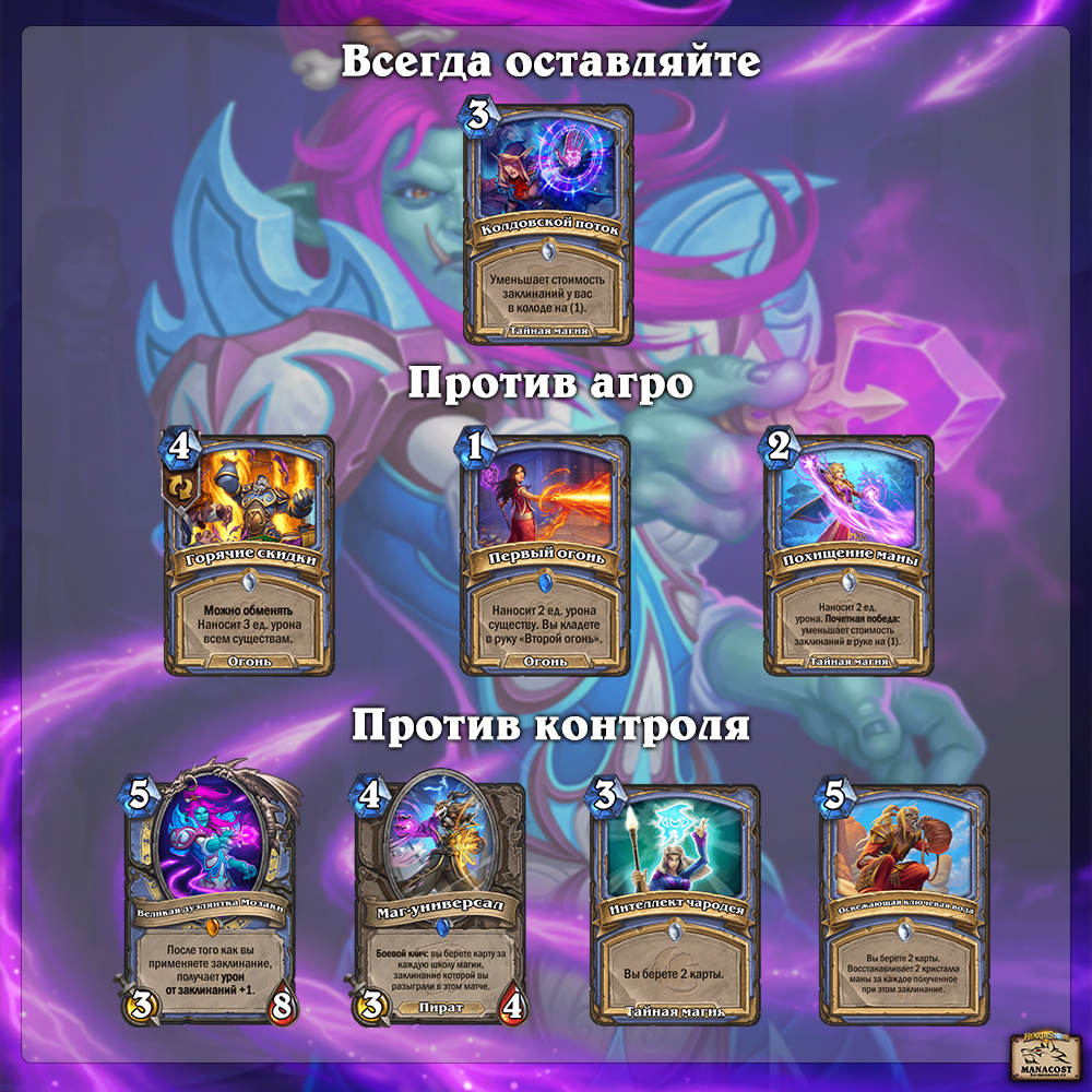 Важный элемент геймплея — удешевление заклинаний. Все просто с Колдовским потоком: заклинание нужно сыграть как можно быстрее. Но похожий эффект есть и у Похищения маны. Заклинание сильное и полезное не только в ОТК ход: с ним можно и готовить летальный урон, удешевляя все заклинания в руке. Помните, что Похищение маны можно усилить с помощью источников урона от заклинаний (Мозаки, раскопки с Археоведения) — в результате и для реализации почетной победы потребуются существа с разным запасом здоровья. Иногда похищение маны можно играть и на своих существ: Мага-универсала, раскопки с Археоведения.