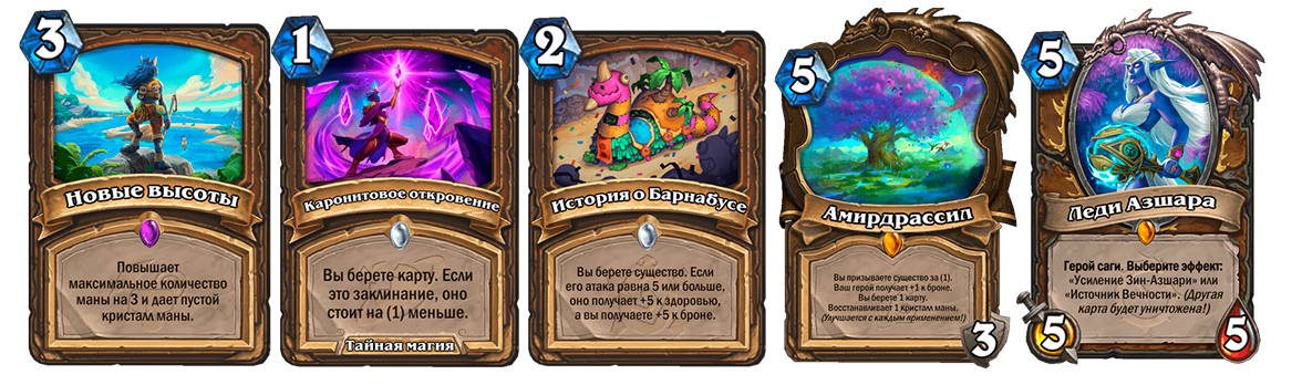 Леди Азшара — новая легендарная карта Друида с новым свойством «Герой Саги». В комплекте с ней идут две области: Зин-Азшари и Источник Вечности. Эффект Азшары довольно прост: она усиливает одну область, а вторую удаляет из игры. Усиления также просты, как и ее клич: