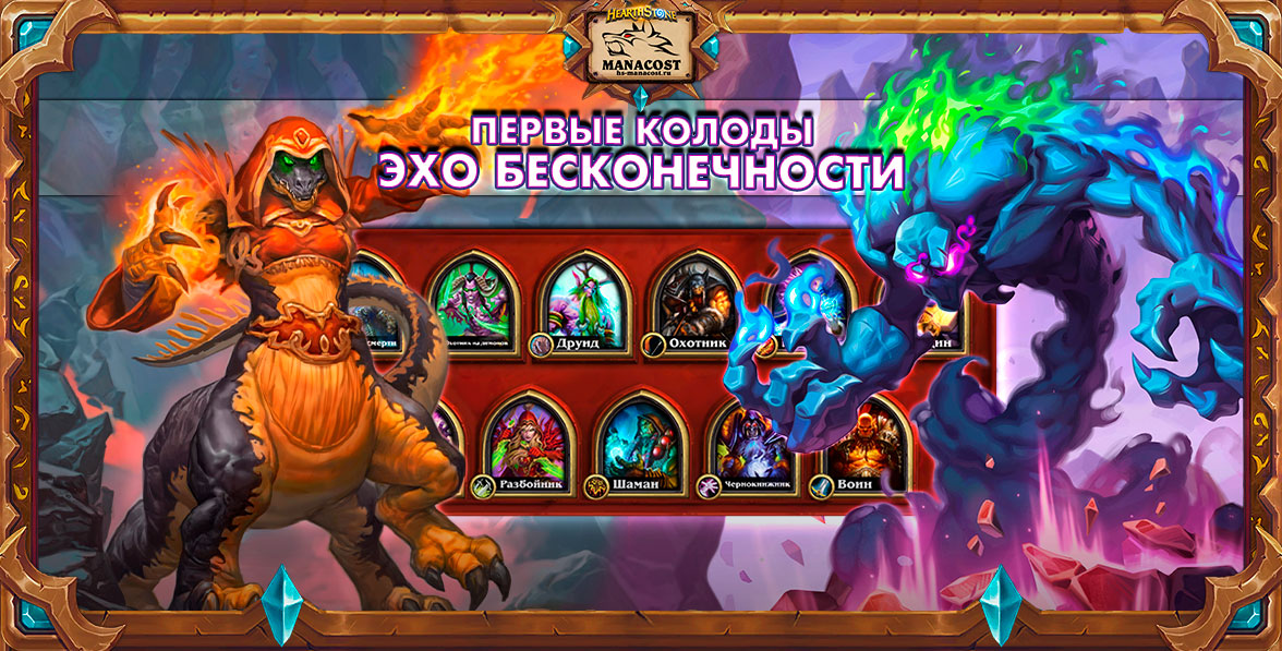 Новый мини-набор «Эхо Бесконечности» уже в игре. Это последний набор года Ящера, и он отсылает ко всем механикам, выпущенным в этом году: темным дарам, зарядке, квестам и перемотке. В этом наборе также вернулась механика двух классов, благодаря чему он должен привнести в игру больше разнообразия, чем обычно.