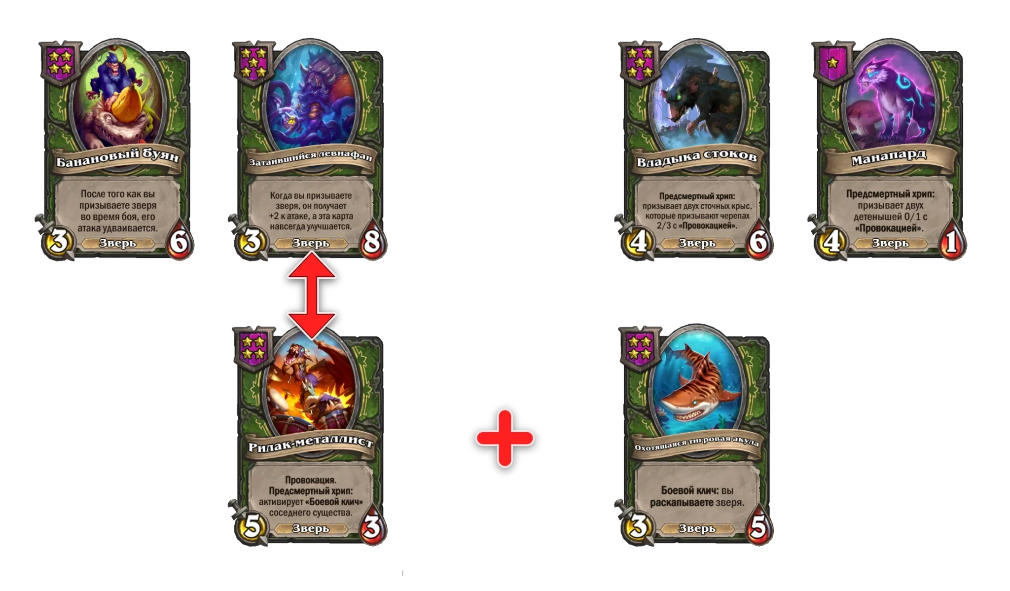 - Затаившийся левиафан — сильнейшее ключевое существо, и стратегия с ним также остается сильнейшей. Для его корректной и эффективной работы потребуется некоторая прокрутка зверей. Кроме того, левиафан отлично сочетается с Банановым буяном: их связка иногда дает зверям до 1000 атаки при призыве.