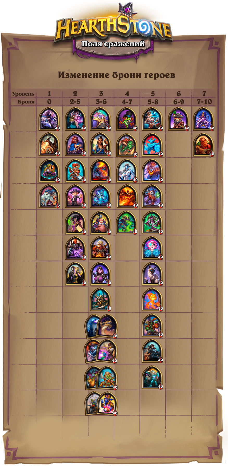 - 4-й уровень (4-7 брони): Танцор Дэрил, Укротитель ящеров Бранн, Королева Азшара, Рагнарос, И’Шарадж.