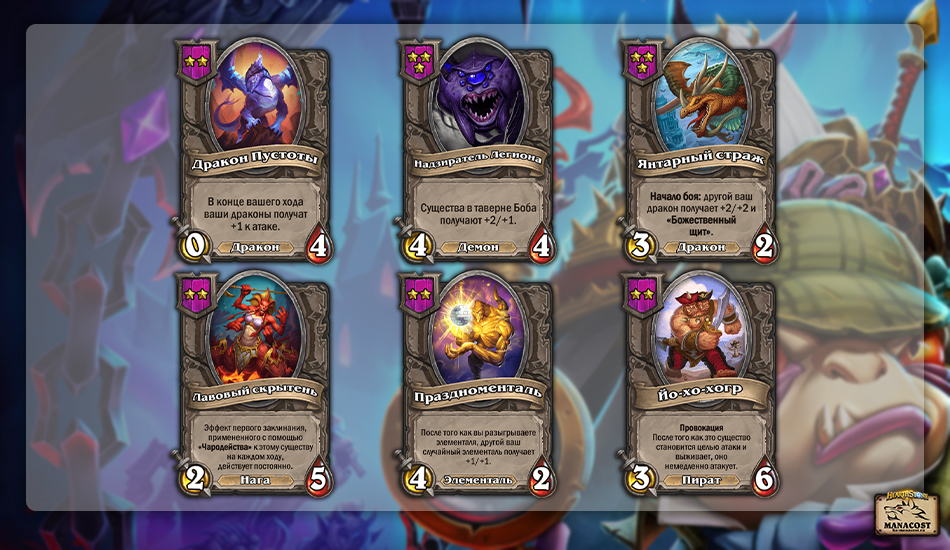 Дракон Пустоты, Надзиратель Легиона и Янтарный страж — три новых существа, которых Blizzard ослабила. Пожалуй, серьезный удар получил только Надзиратель Легиона — +1 здоровье для всех существ, это много при условии, как много теперь у демонов синергий пожираний. Нерф в первую очередь затронет начальную стадию партий, когда эти бонусные характеристики особенно критичны. Демонами все еще можно играть что в начале, что в лейтгейме. Надзиратель Легиона хорош, но это не основополагающая карта стратегии.