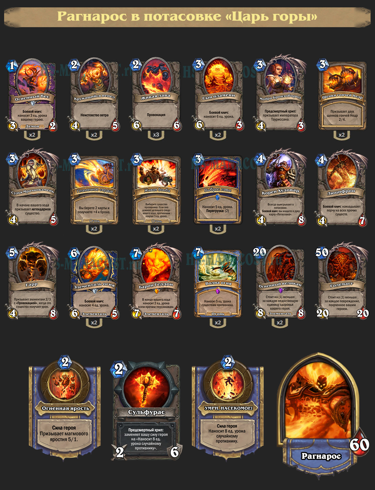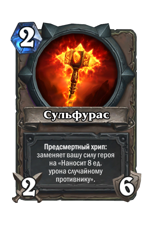 Нефариан получает рандомную, но очень мощную силу героя, которая позволяет генерировать заклинания каждый ход. Сила героя Рагнароса призывает всего лишь яростня 5/1, зато он сразу же экипирован Сульфурусом, который даст уже привычные 8 ед. урона случайной цели после шести ударов.