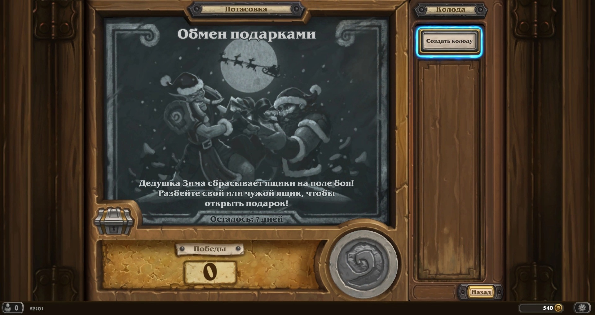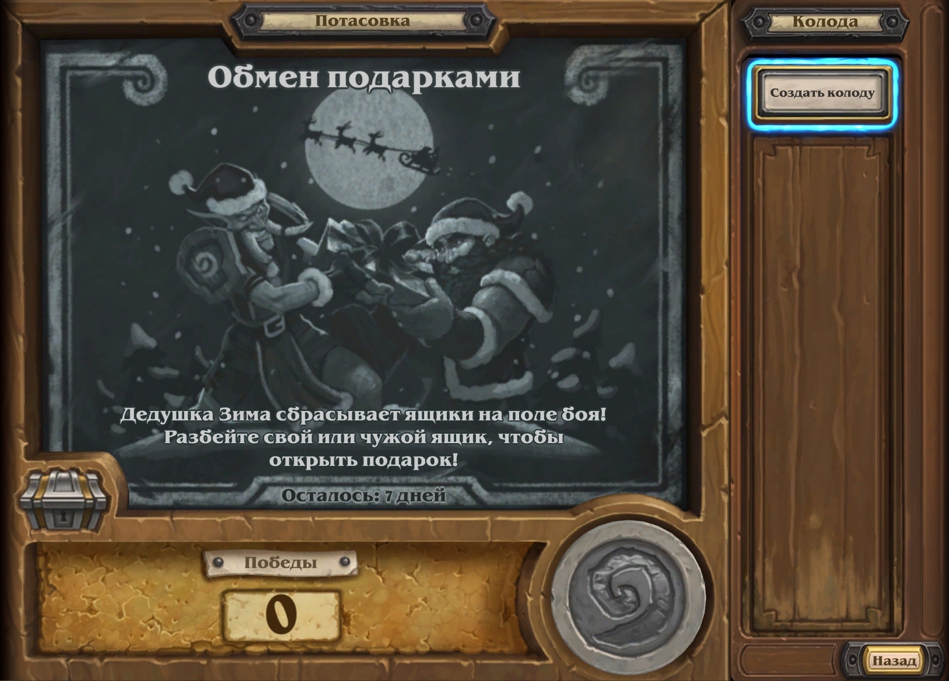 Ящики имеют характеристики 0/4 и «Предсмертный хрип: атакующий игрок получает украденный подарок». Подарок – это карта за 1 маны, которая позволяет раскопать сокровище. Все раскопанные сокровища стоят на 5 маны меньше.