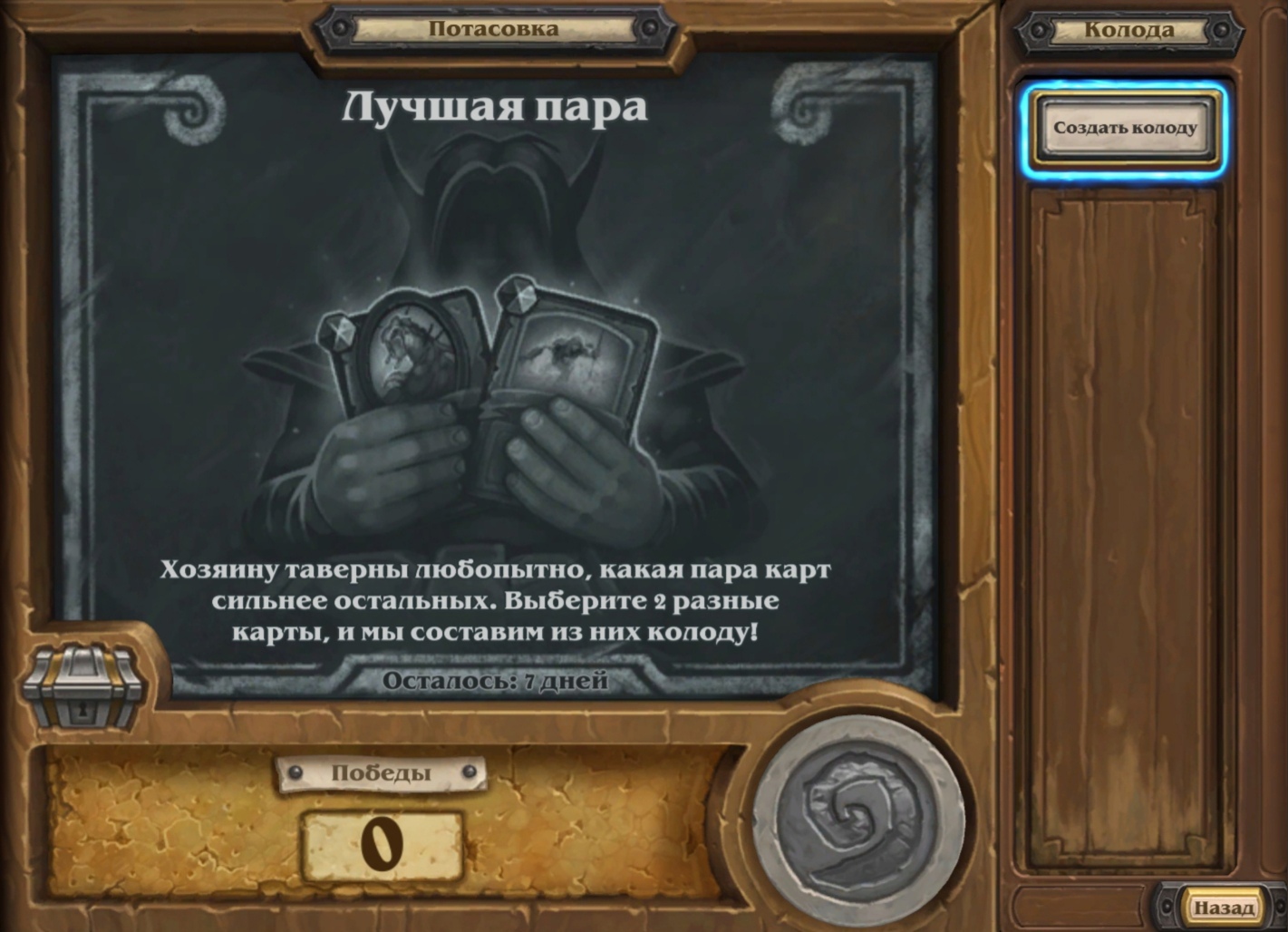 Описание потасовки: Хозяину таверны любопытно, какая пара карт сильнее остальных. Выберите 2 разные карты, и мы составим из них колоду!