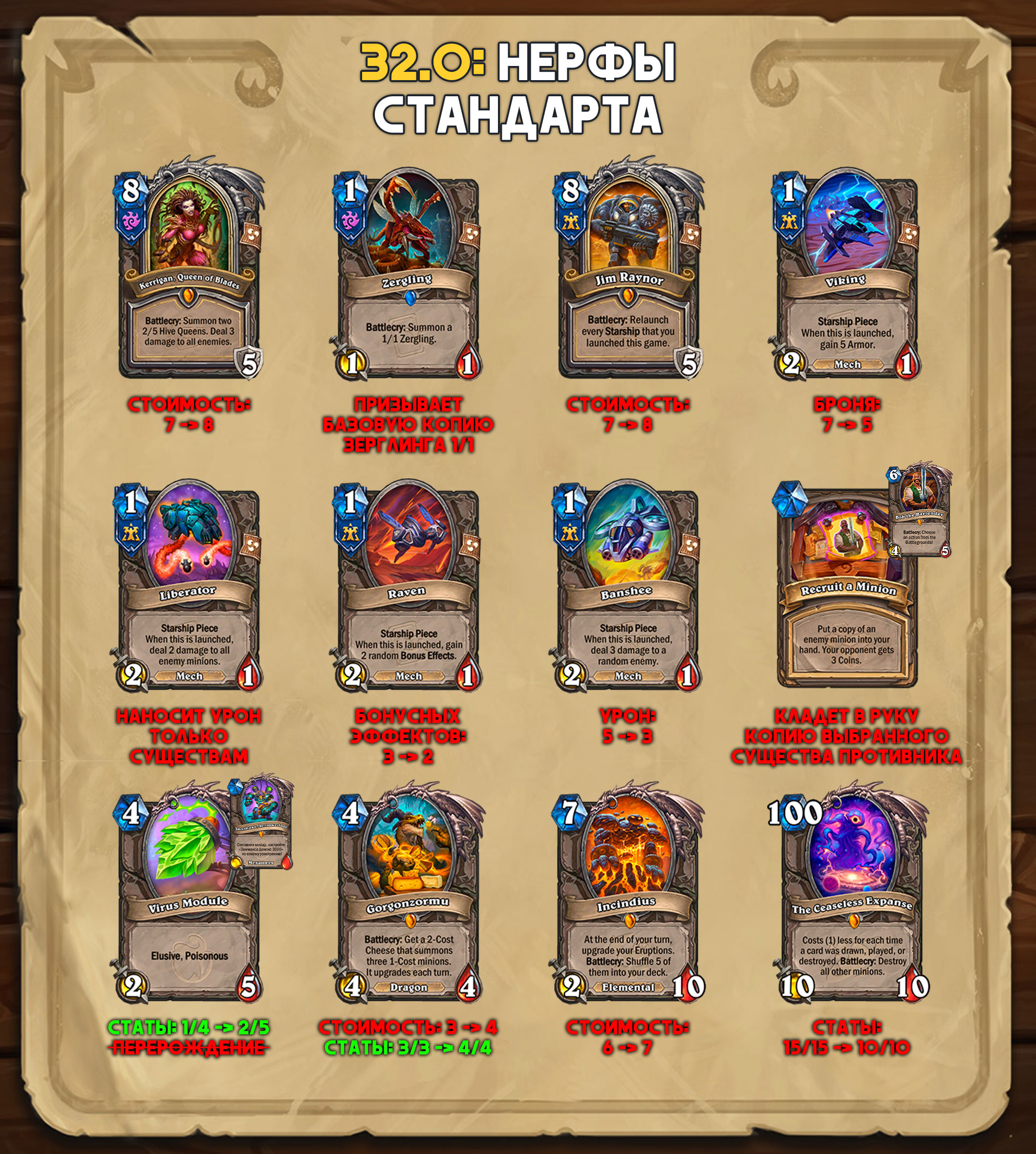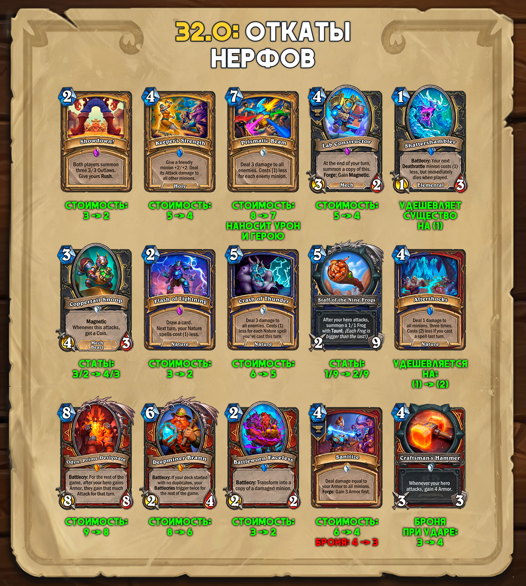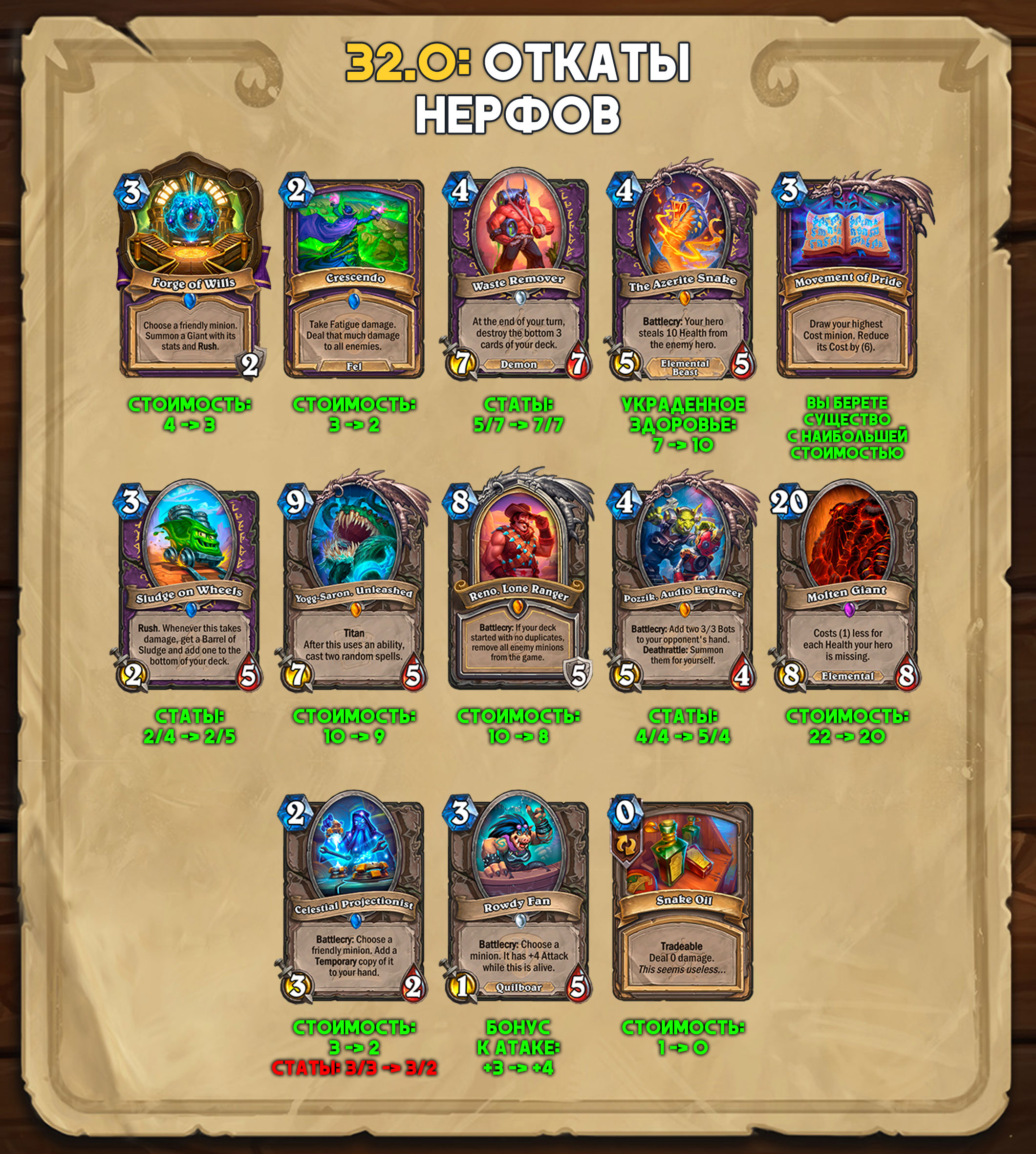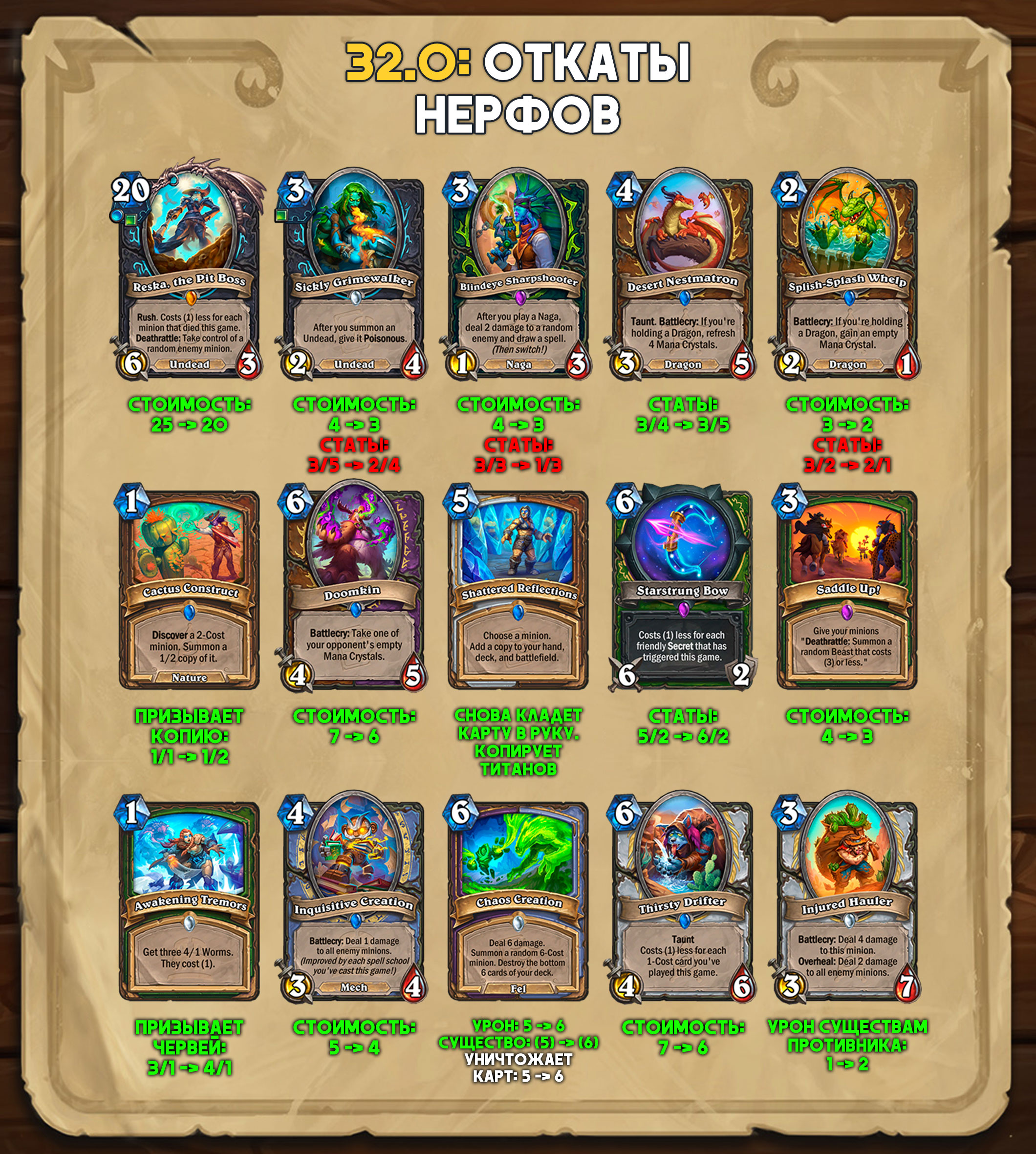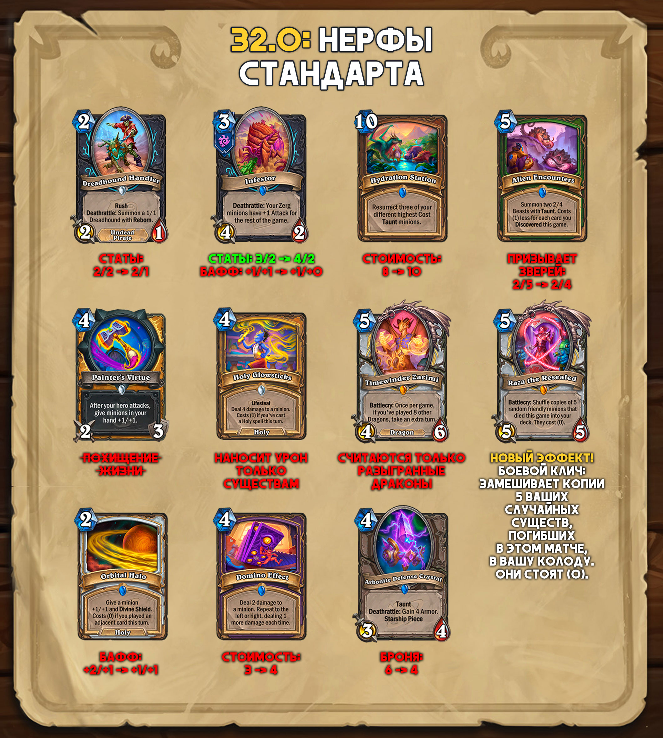 И наконец, вскоре выйдет целый ряд изменений карт, включая уже традиционные изменения карт, которые покинут Стандарт и отправятся в Вольный формат, а также изменения карт, которые останутся в Стандарте в году Ящера. Все эти изменения вступят в силу 18 марта в обновлении 32.0, то есть будут применены и во время теорикрафт-стримов, и во время предрелизной потасовки, и на отборочных турнирах и, конечно же, к выходу «Объятий Изумрудного Сна». Изучайте внимательно — веселье начинается уже завтра!