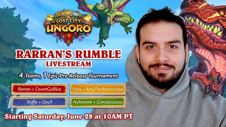 Приготовьтесь к разборкам с Rarran! В потасовке доисторического масштаба сойдутся 8 известных стримеров ККИ. Они разделятся на 4 команды по 2 игрока и будут составлять колоды с картами грядущего дополнения Hearthstone «Затерянный город Ун’Горо». Зрители смогут взглянуть на мощные задачи, смертоносных динозавров и других интересных персонажей нового набора. Участники будут сражаться друг с другом попарно в формате «Завоевание», пока шум схватки не стихнет и не станет ясно, кто победитель.