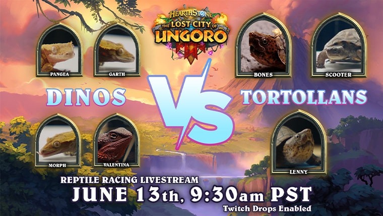 В кратере Ун’Горо, куда вернется Hearthstone в новом дополнении, вы наверняка наткнетесь на группу блуждающих динозавров или поселение тортолланов. В честь выхода Затерянного города мы устроим дружеское соревнование между ними В РЕАЛЬНОСТИ! Или почти в реальности. К сожалению, динозавры вымерли около 365 миллионов лет назад, поэтому представлять их будут ящеры, а тортолланов, как несложно догадаться, черепахи. Соревнование будет состоять из трех дисциплин: гонки, поедание и карабканье. (Да, черепахи умеют карабкаться!) Победителем станет та сторона, которая одержит наибольшее число побед. За кого будете болеть вы — за грозных динозавров или потрясающих тортолланов?