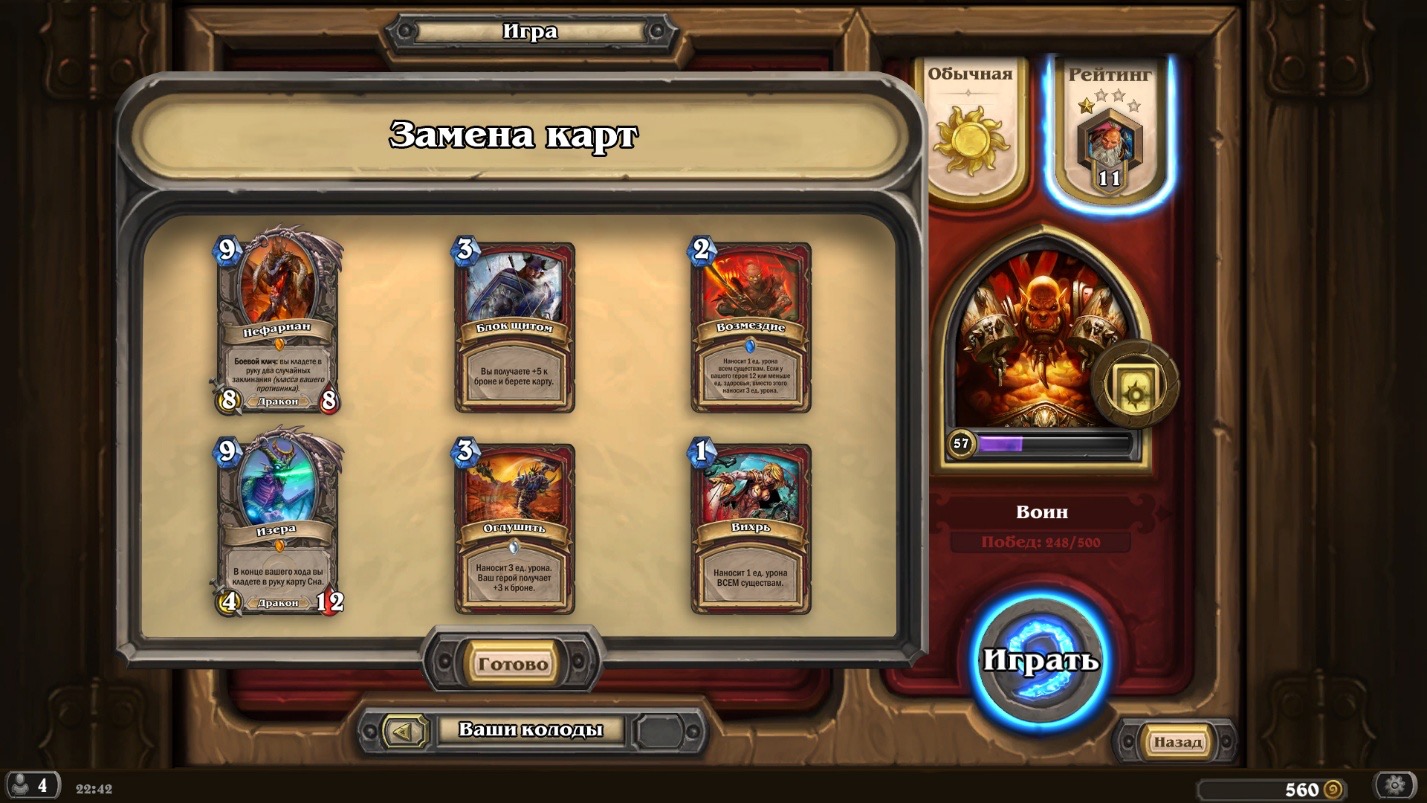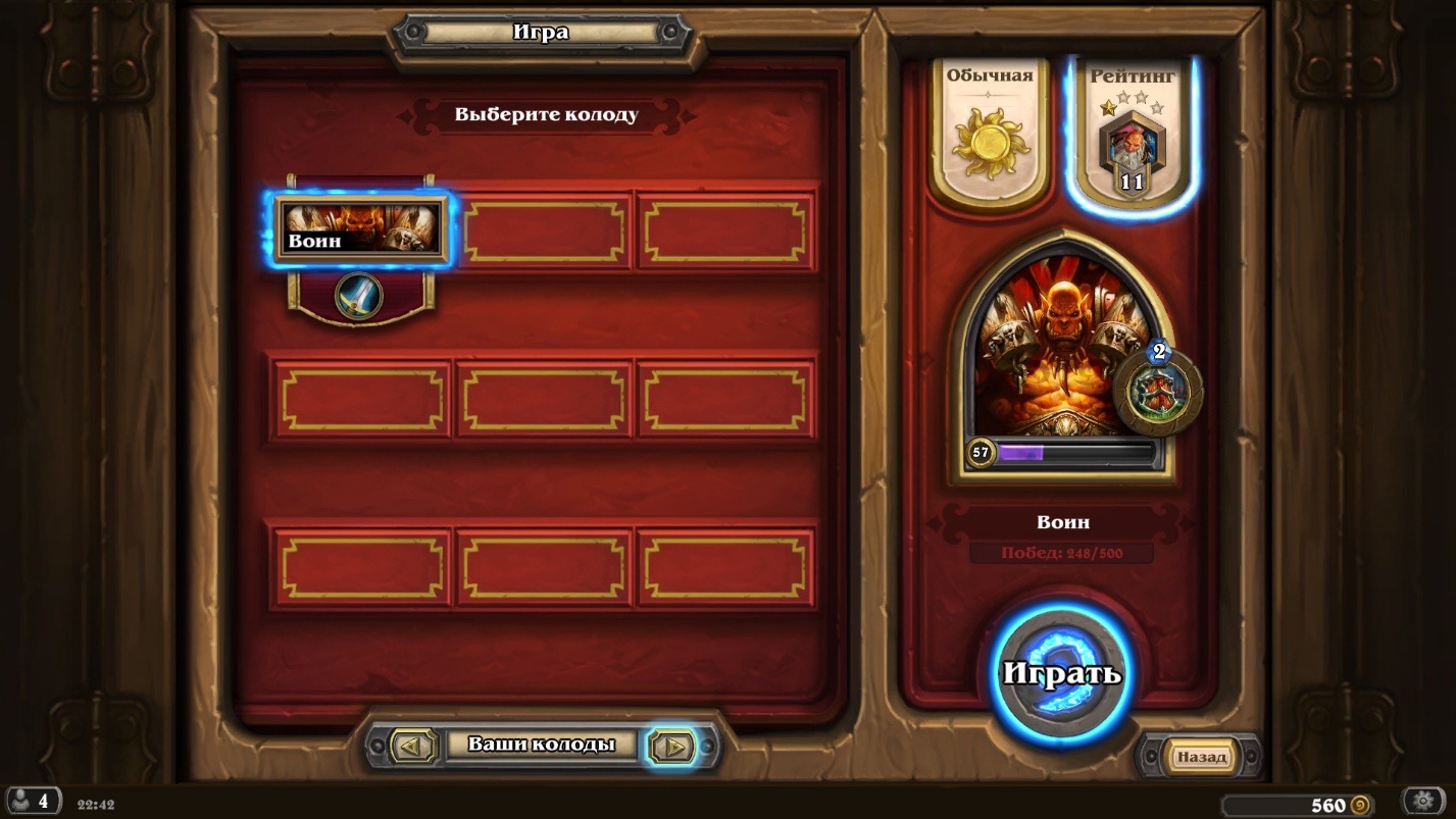 Для перехода игроков от второго этапа к третьему разработчики организовали систему смены экранов списков колод. Первый является светлой памятью времени начала игры, второй – рабочей областью, предназначенной для ежедневного использования. При этом не всегда игрок сразу начинает играть только созданными самостоятельно колодами. Если для определенного класса карт вообще нет, то можно без труда возвратиться из третьего на второй этап. Думаю, из-за отсутствия четкой границы между полностью самостоятельной игрой и использованием готовых колод разработчики оставили возможность всегда возвращаться к стартовым колодам.