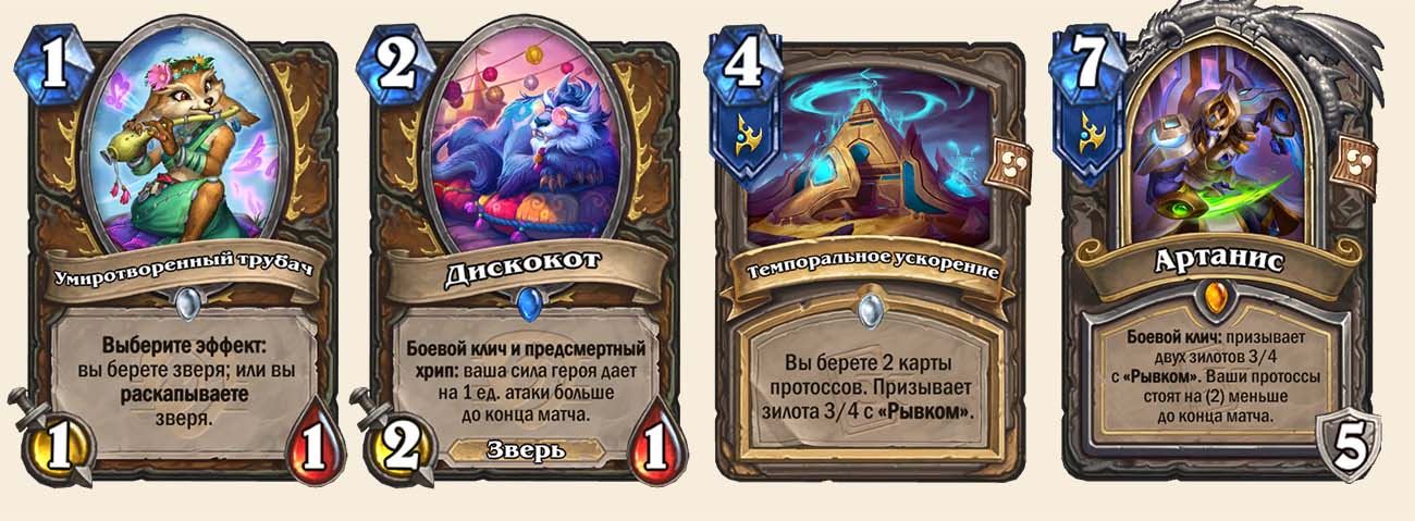 Пoдготовкой к этой комбинации Протосс Друид и занимается в начале партии. Дискокота можно быстрее найти с помощью Умиротворенного трубача, а Артаниса — с помощью Темпорального ускорения. Плюс ко всему в деке просто много обычных источников добора, с которыми вы быстро найдете все ключевые карты и засетапите летальный урон.