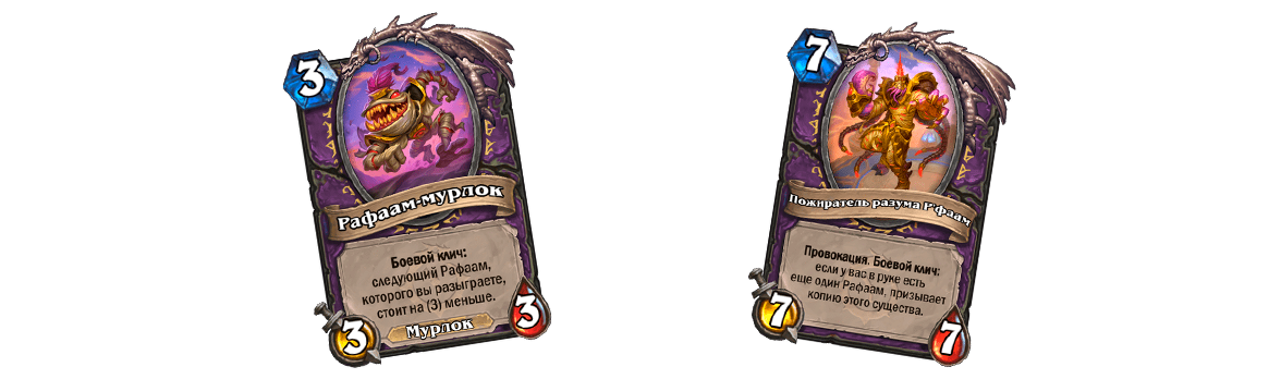 Для нас наиболее любопытным стал бафф сразу трех Рафаамов из десяти. Мини-рафаам получил незначительное, но крайне полезное изменение — добор дополнительного Рафаама с боевого клича лишним не бывает. Зеленый Рафаам теперь усиливает Рафаамов не только в руке, но и на столе, а Вождь Рафаам дает броню, если еще один Рафаам находится у вас в руке, а не на игровом поле.