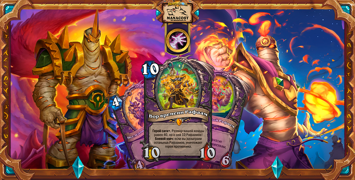 Согласно статистике HSGuru и HSReplay, Рафаам Чернокнижник имеет две более-менее рабочие сборки: с драконами и рамп-версию с тяжелыми картами.