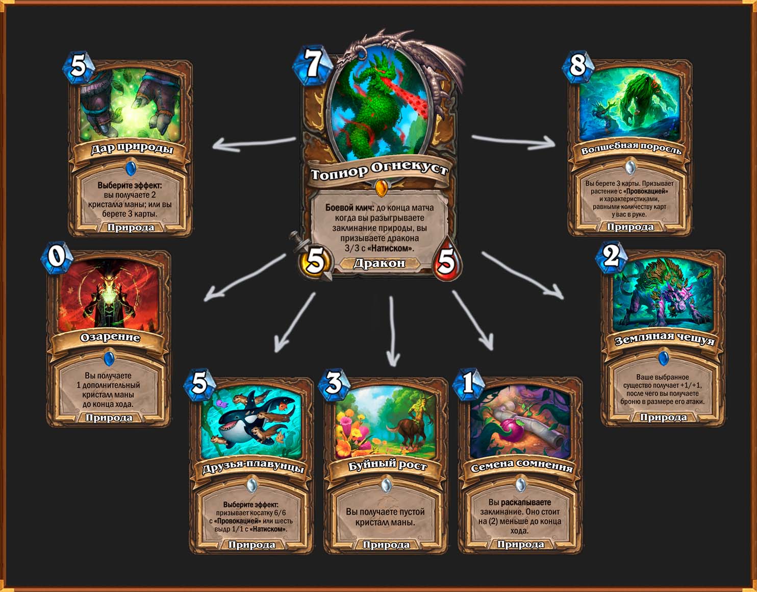 Еще одна важная составляющая колоды — Топиор Огнекуст. Этот легендарный дракон заходит не в каждой партии вовремя, но когда он появляется, то оказывает серьезное влияние на геймплей Рамп Друида. Вся колода построена вокруг этого дракона: в ней много заклинаний Природы, с которыми вы сможете стабильно призывать дополнительные угрозы с натиском. 3/3 существа хороши и в защите, и в нападении. Некоторые сборки даже берут дополнительные баффы, чтобы сделать сильнее мелкие угрозы Рамп Друида.