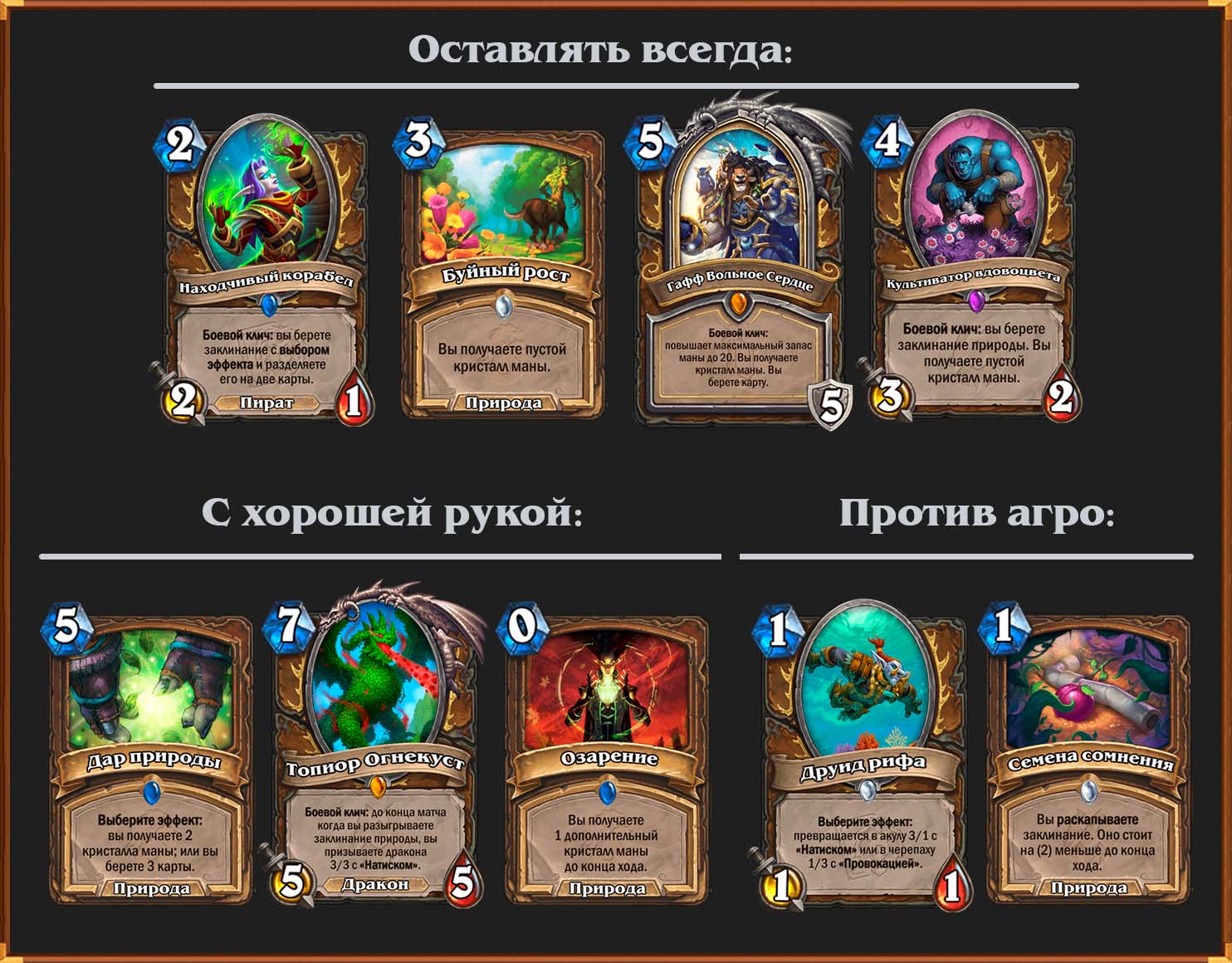 Пример: в руке есть Буйный рост и Гафф Вольное Сердце. Если у Друида есть Монетка, нет смысла отдавать ее на второй ход, чтобы раньше сыграть Буйный рост. Ведь на следующий ход маны на Гаффа Вольное Сердце не хватит. Другое дело, если у Друида есть Буйный рост и Культиватор вдовоцвета: тогда Буйный рост можно играть через Монетку, а на следующий ход использовать четвертый дроп и с него рассчитывать на заход Дара природы или Волшебной поросли.