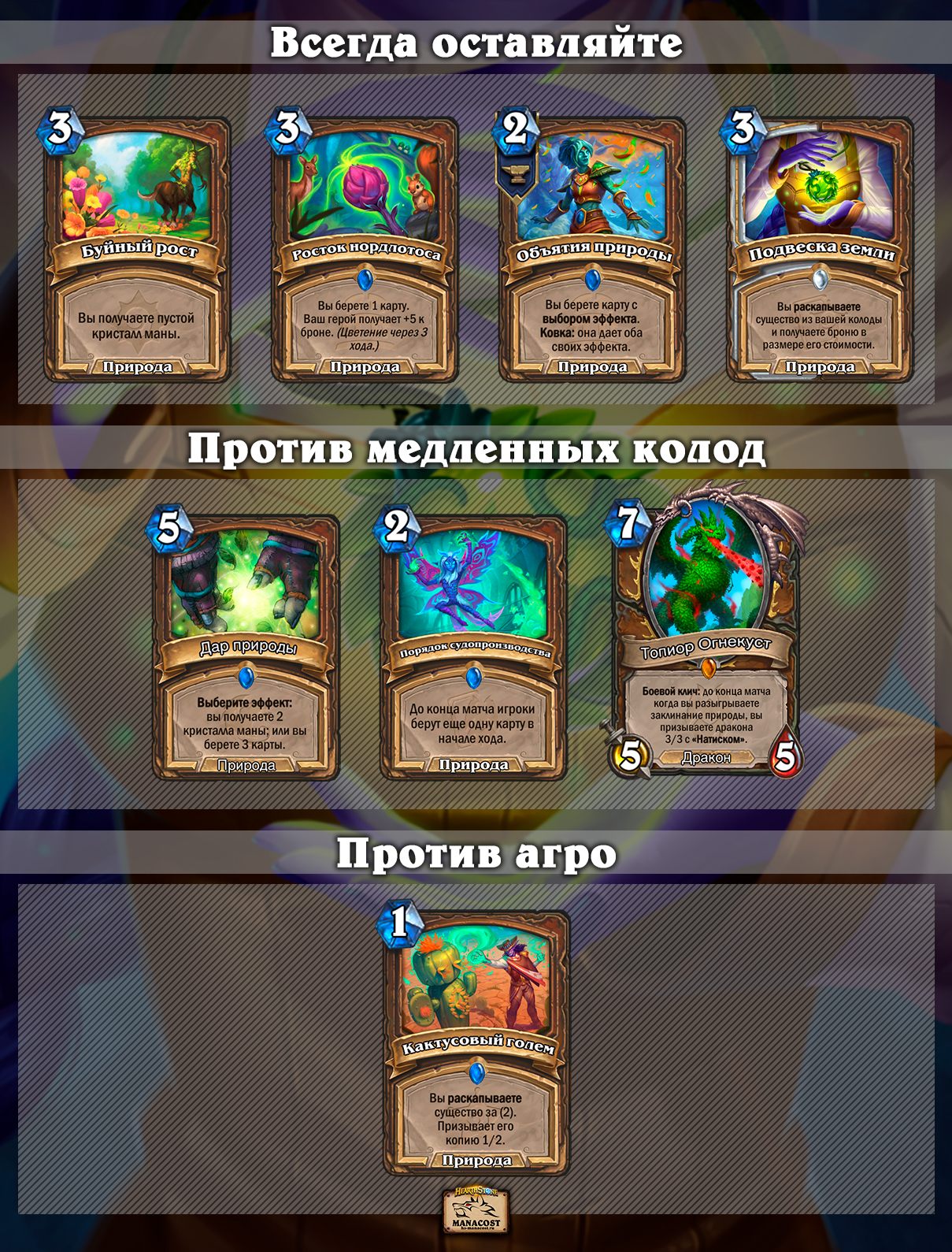 Как и все Рамп Друиды, этот рассчитывает разогнаться по мане в начале партии, чтобы как можно быстрее добраться до 10 кристаллов и играть топовые тяжелые карты и их комбинации. Набор привычный: Буйный рост, Дар природы — к тому же Дар природы можно баффнуть Объятиями природы.