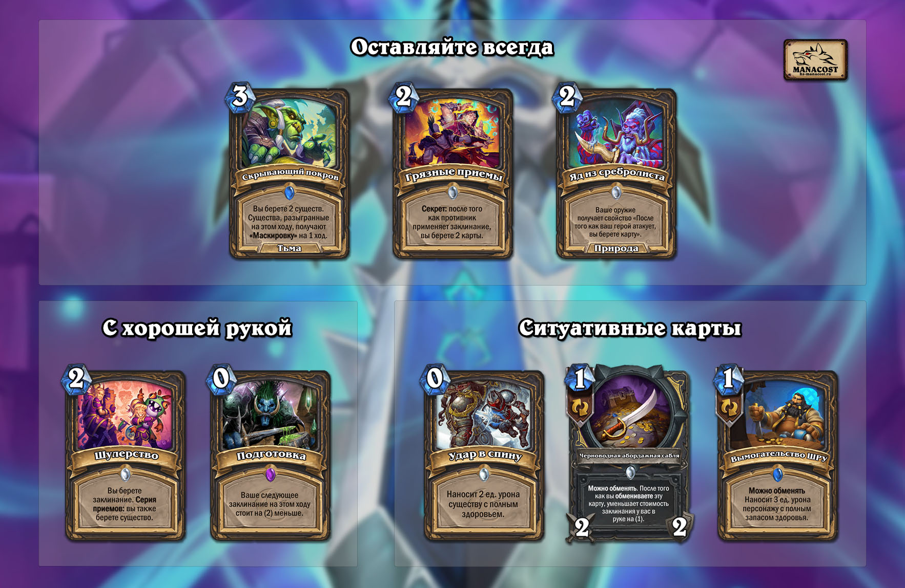 • Шулерство оставляйте, только если оно не помешает вашей кривой маны. Обычно его оставляют с Монеткой, Подготовкой или картами, которые заполнят первые ходы (например, с оружием на обмен + Скрывающим покровов).