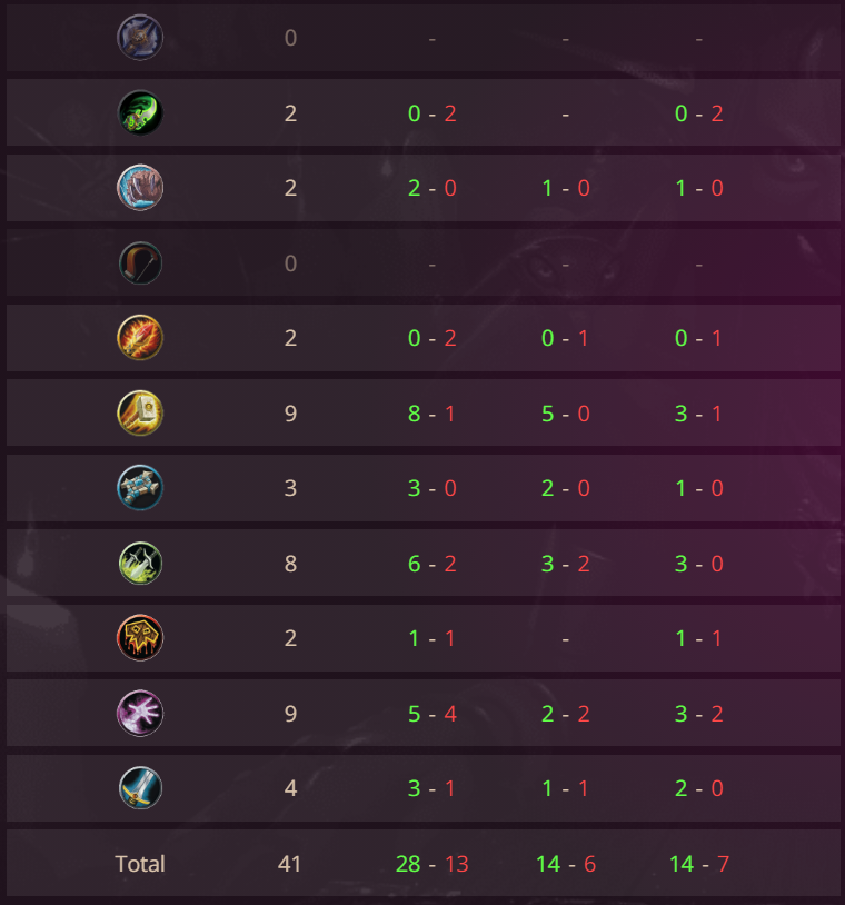 Также можно отметить, что и положительный винрейт, которого достигают немногие игроки, совсем невысокий и почти не превышает 50%. Хотя есть и те, кто играют вполне успешно, например pocket_train с результатом 28-13 в топе Легенды.