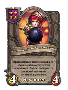 - До изменения: Предсмертный хрип: «Наносит 4 ед. урона случайному существу противника. Эффект повторяется за каждый ваш механизм, погибший в этом бою».
