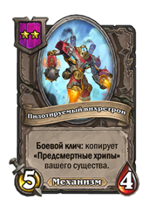 - После: «Предсмертный хрип: Наносит 3 ед. урона случайному существу противника за каждый ваш механизм, погибший в этом бою»*.