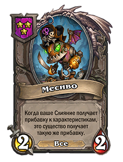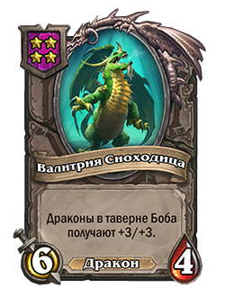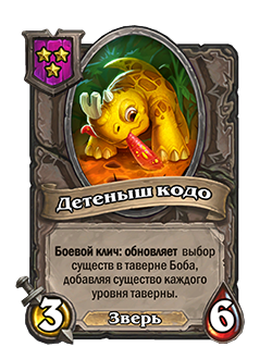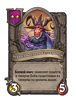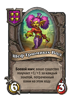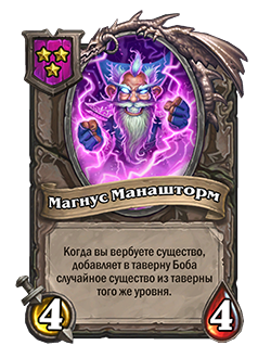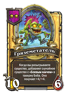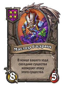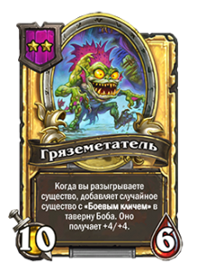 - [Золотая версия] До изменения: когда вы разыгрываете существо, добавляет 2 существ с «Боевым кличем» в таверну Боба.