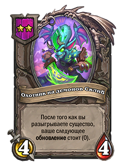 - После: уменьшает стоимость двух нейтральных существ в вашей руке стоимостью (4) или больше на (2).