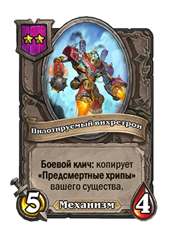 - До изменения: Предсмертный хрип: «Наносит 4 ед. урона случайному существу противника. Эффект повторяется за каждый ваш механизм, погибший в этом бою».