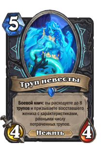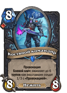 Карта делает немало — восстанавливает здоровье, наносит урон и призывает хороший стол. Однако она очень тяжелая, а удешевить ее Рыцарю смерти легким способом невозможно. Да и трата большого количества трупов картами без или только с 1 руной — не такая простая задача. Очень похожий эффект имеет Сир Денатрий, и в сравнении даже будучи понерфленным он выглядит лучше.