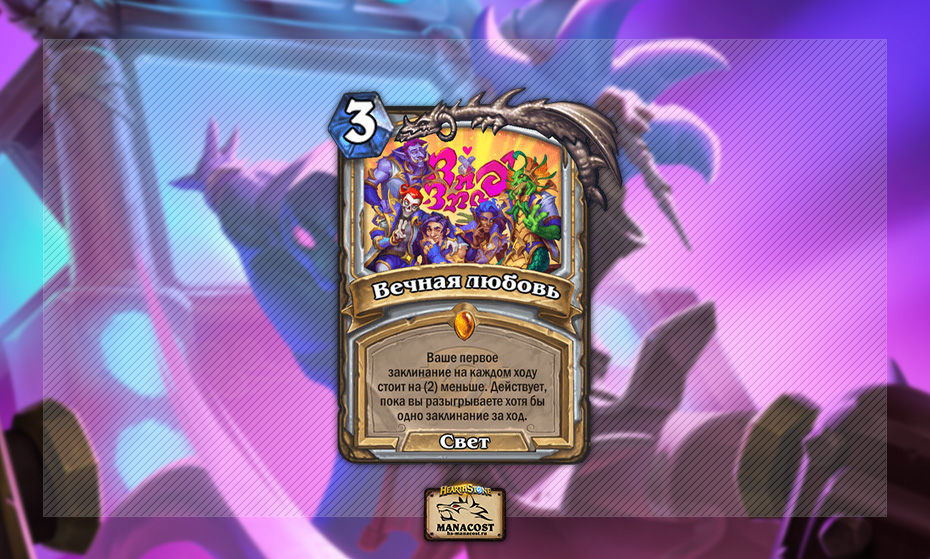Эта карта кажется одной из самых сложных для оценивания, но очень многие игроки пророчат ей большую роль в мете. Если в вашей колоде есть много заклинаний, Вечная любовь является рампом Друида — Буйством природы или Даром природы, причем ваш максимум маны становится равен 12 кристаллам. Это, конечно, далеко не Гафф Вольное Сердце, но тоже звучит довольно интересно.