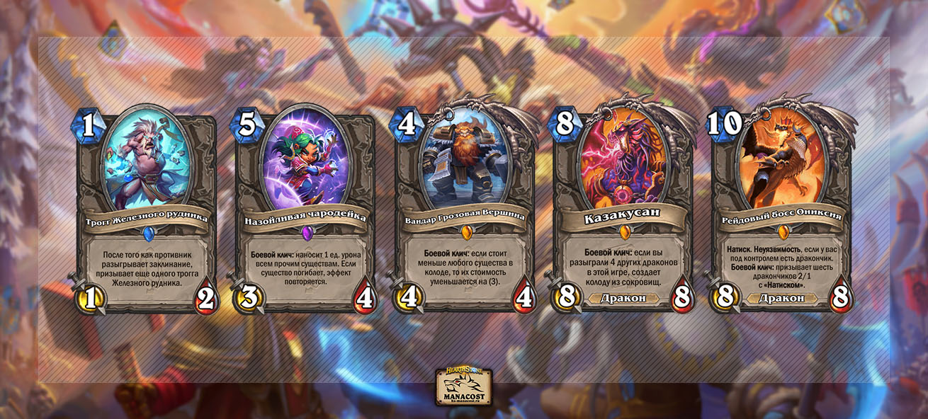 По части нейтральных карт Альтерак был очень скудным. Примечательными остаются только Трогг Железного рудника и Назойливая чародейка. Побольше разнообразия принес мини-набор с Казакусаном и Рейдовым боссом Ониксией.