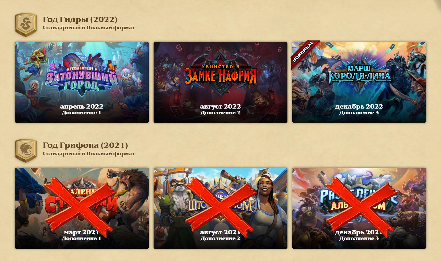 В Hearthstone есть свое летоисчисление. Каждый новый год начинается весной. Вместе с его началом выходит первое дополнение этого года. Со сменой года из Стандарта уходят сразу три дополнения, которые вышли в позапрошлом году по летоисчислению Hearthstone.